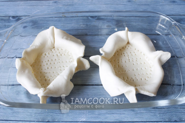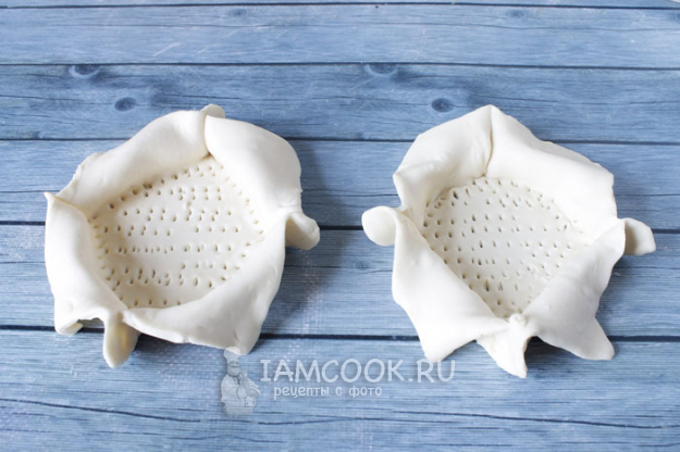 На середине каждой стороны делаем глубокий защип, формируя корзиночки. Донышко часто прокалываем вилкой.