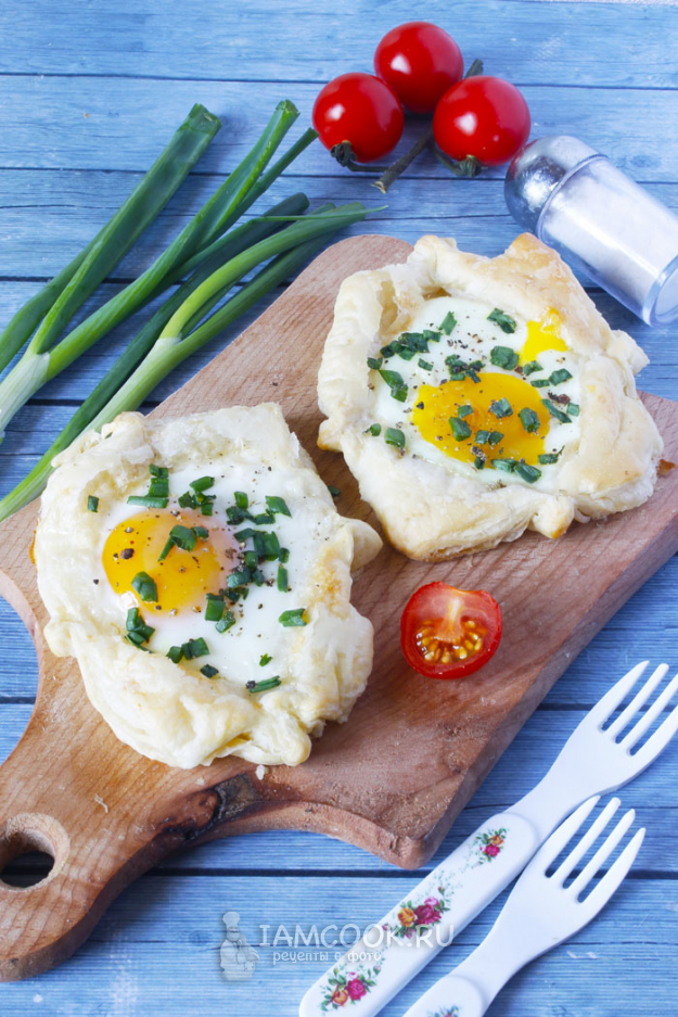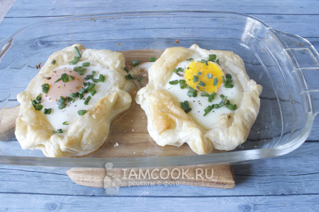 Возвращаем форму в духовку и готовим яичницу в слоеном тесте примерно 10-12 минут. Готовые яйца посыпаем перцем и луком (или другой зеленью).