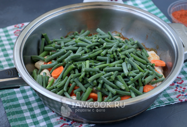 Затем в сковороду добавить немного горячей воды из чайника, чтобы ничего не пригорело, накрыть крышкой и убавить огонь. Готовить всё вместе 15-20 минут, пока стрелки не станут мягкими.