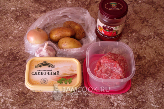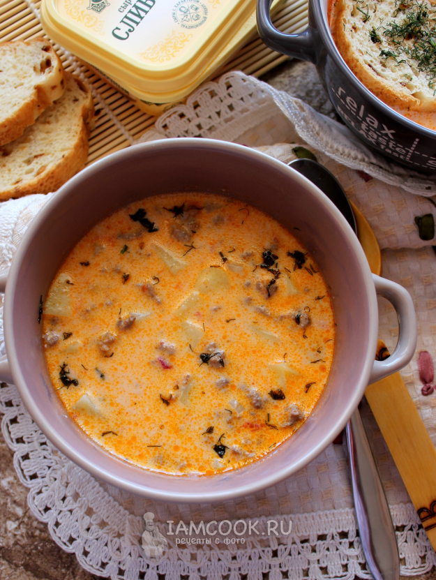 Для супа чизбургер с фаршем подготовьте ингредиенты по списку.