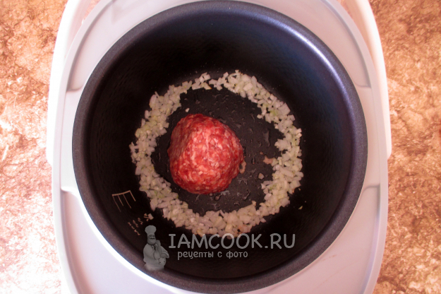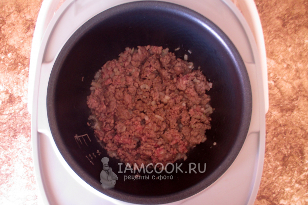 Первым делом нужно обжарить нашинкованный лук на растительном масле, к нему добавить фарш.