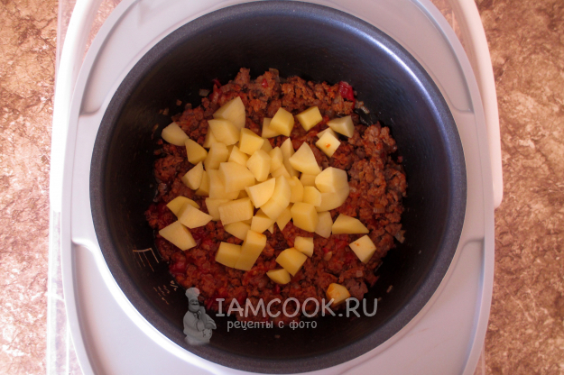 Нарежьте картофель кубиком, отправьте к фаршу, влейте горячую воду (или кипяток).