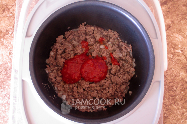 Затем перемешайте фарш с томатным соусом и потушите пару минут. У меня томатный соус - аджика с кусочками сладкого перца.