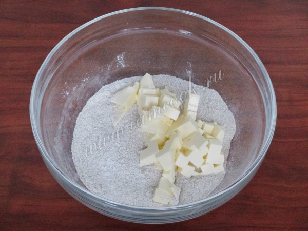 Муку нужно просеять в миску, а затем на неё натереть на крупной тёрке замороженное масло или охлажденное масло нарезать кубиками.