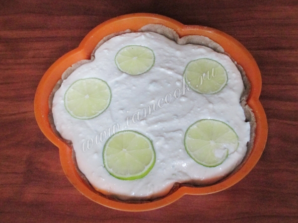 Половинку лайма нарежьте на тонкие кружочки и украсьте ими тарт.