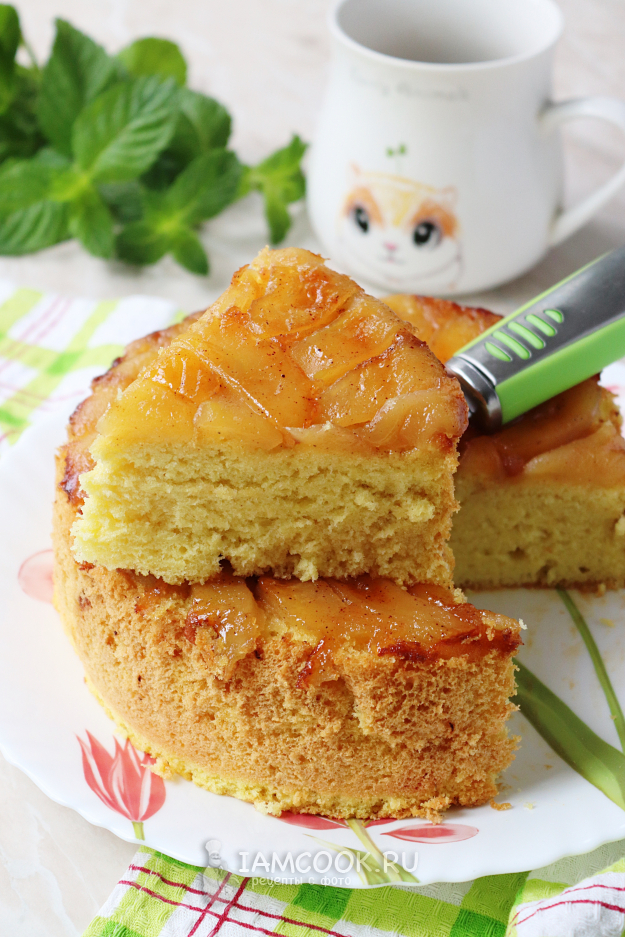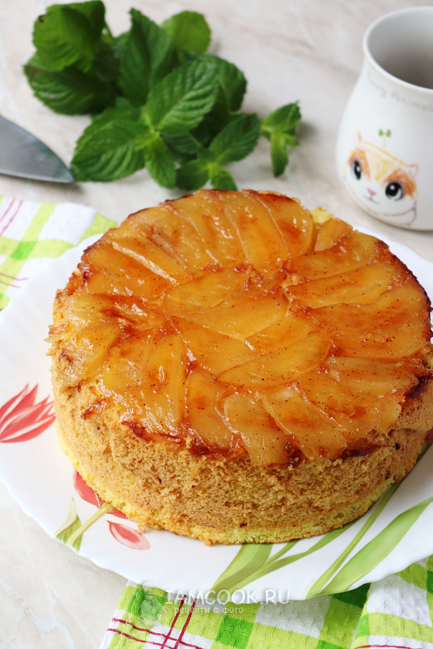 Аккуратно освободите пирог от формы и переверните на плоскую тарелку, дном вверх. Дайте выпечке немного остыть, после чего подавайте на стол.