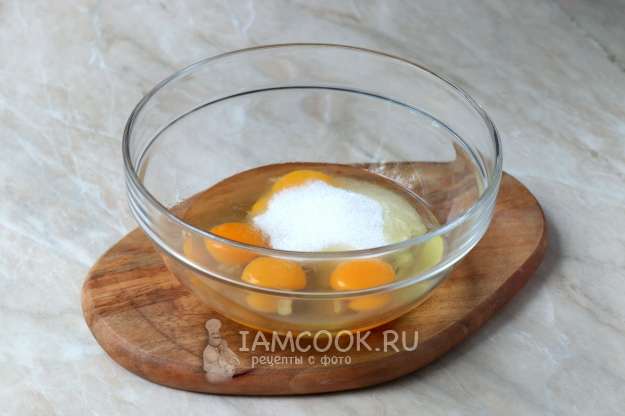 А пока займитесь тестом. В глубокую сухую миску вбейте куриные яйца, добавьте сахарный песок и немного ванильного сахара.