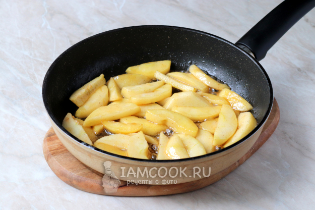 Помешивая, готовьте 5 минут. За это время лишняя жидкость испарится, а яблоки покроются карамельной плёнкой. Выключите нагрев и дайте яблокам немного остыть.