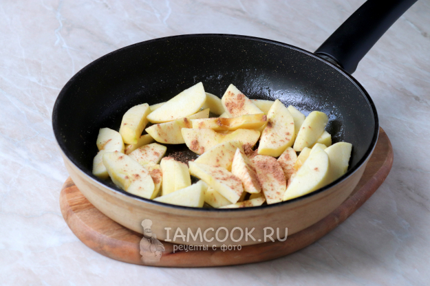 В получившийся сироп выложите яблочные дольки. Для аромата посыпьте их молотой корицей.
