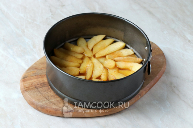 Дно формы застелите пергаментом и выложите остывшие яблоки красивым узором.