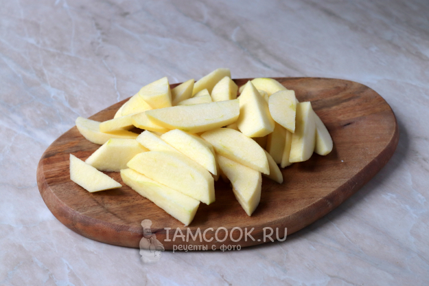 Тем временем очистите яблоки и нарежьте их одинаковыми ломтиками, удалив семенную коробочку.