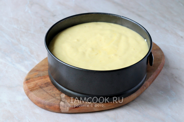Поверх яблок вылейте бисквитное тесто и разровняйте его.