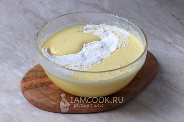 Введите дважды просеянную пшеничную муку и разрыхлитель.