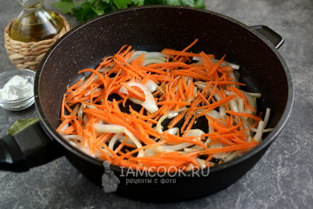 Разогрейте рафинированное масло в сковороде, выложите в него тонко нашинкованные лук и морковь, обжаривайте пару минут - до мягкости.