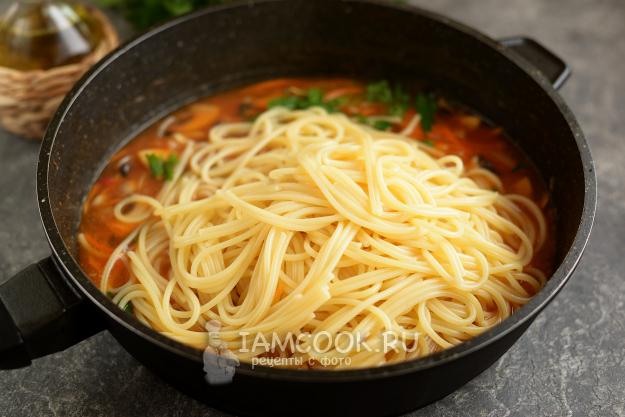 Подавать спагетти в грибном соусе нужно сразу же после приготовления, иначе макароны впитают весь соус и сильно разбухнут.