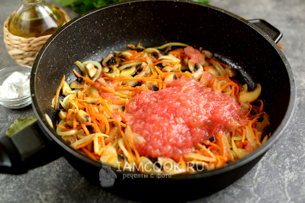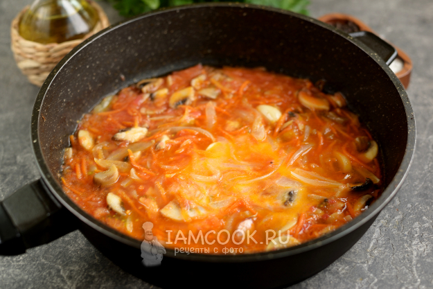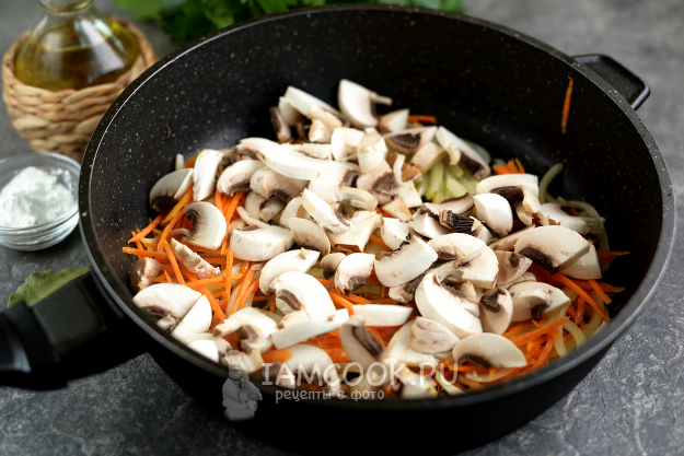 Грибы нарежьте тонкими ломтиками, выложите в сковороду, накройте крышкой и тушите на умеренном огне минуты 3. Под крышкой грибы пустят сок, в нем овощи и будут тушиться. При желании шляпки грибов можно очистить от кожицы.
