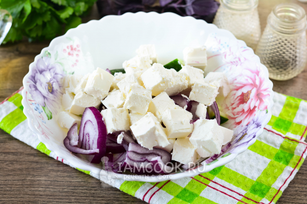 Сложите в удобную миску все подготовленные компоненты - лук, огурцы и сыр.