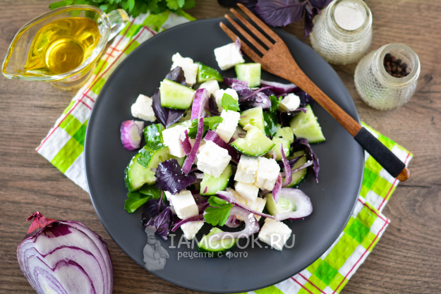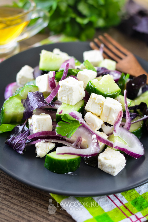 Готовый салат с фетой и огурцами выложите в порционную посуду и подавайте к столу, дополнив солью и черным перцем. При желании гости смогут добавить специи по вкусу. Сыр фета обычно соленый, так что соль может и не понадобиться. Приятного вам аппетита!