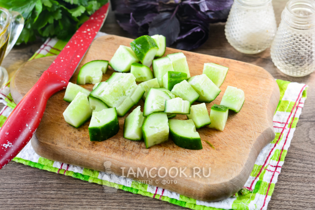 Промойте свежие огурцы, срежьте хвостики и нарежьте овощи крупными кубиками. Огурцы можете попробовать, чтобы не были горькими - в летний период такое бывает.