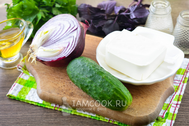 Подготовьте все ингредиенты для салата с фетой и огурцами.