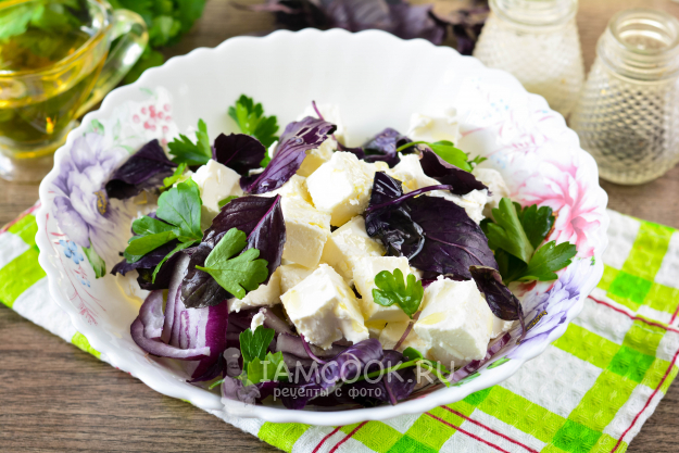 Добавьте в салат вымытые листочки базилика и петрушки, перемешайте и полейте оливковым маслом, лучше холодного отжима - оно более ароматное и с легкой горчинкой, идеально подходит для феты и свежих овощей.