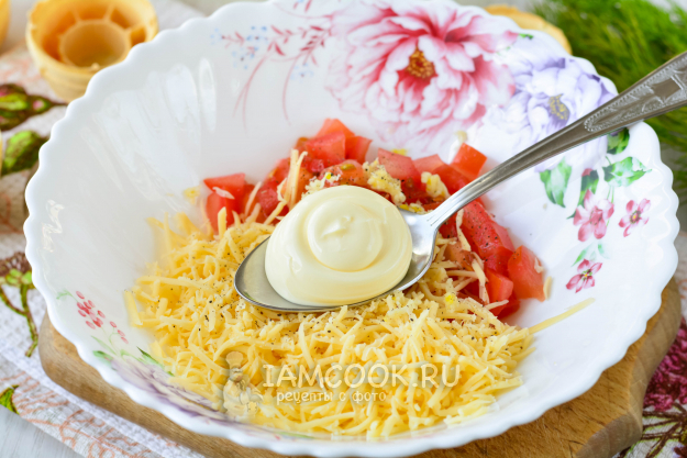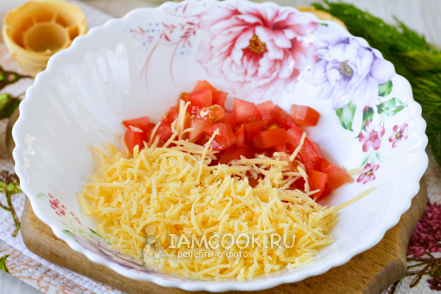 Сложите в глубокую мисочку натертый сыр и нарезанные помидоры.