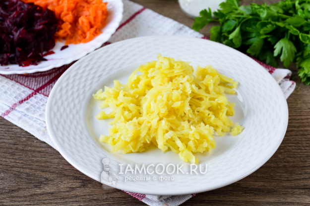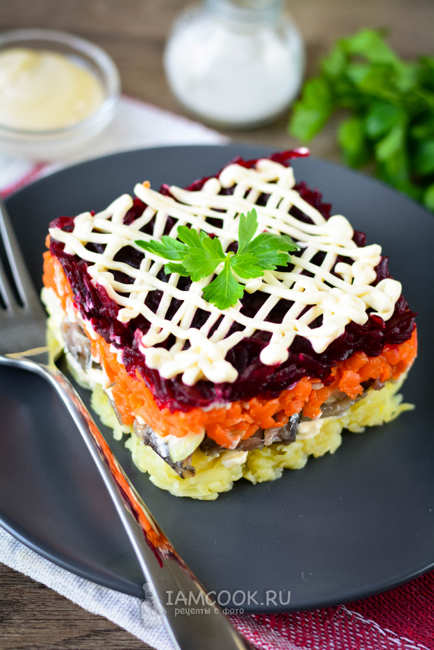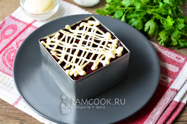 Завершите салат слоем натертой свеклы и снова полейте майонезом.