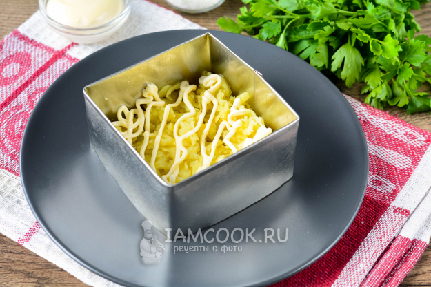 Салат выкладывайте слоями. Первым слоем идет натертый картофель. Посолите его, можете поперчить. Полейте этот слой тонкой сеточкой майонеза.