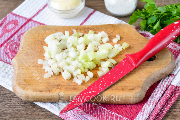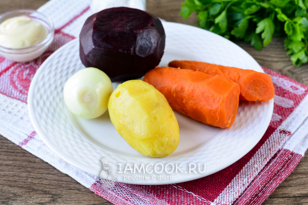 Сваренные овощи очистите от кожуры. Также очистите и сполосните небольшую репчатую луковицу.