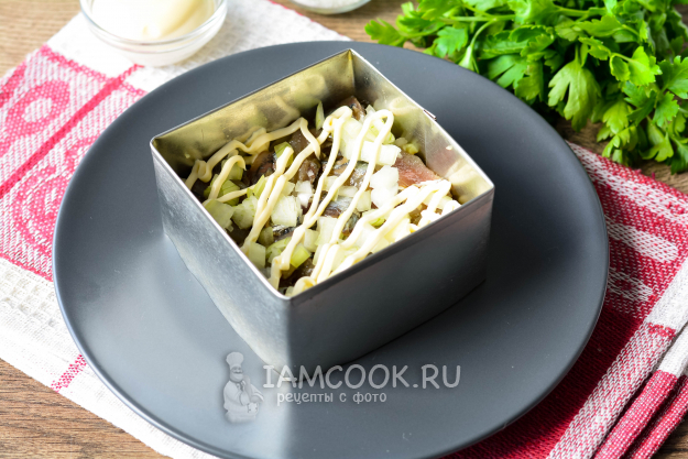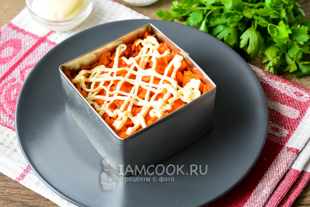 Выложите натертую морковку и также смажьте майонезом, добавьте специи по вкусу.