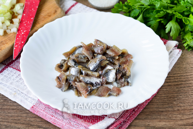 Почистите хамсу для салата - достаточно будет убрать головы, хребет и хвостики. Мелкие косточки не будут ощущаться в салате. Нарежьте рыбу средними кусочками.