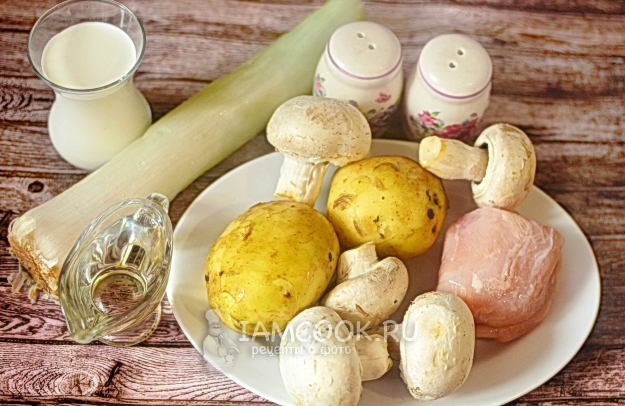 Подготовьте продукты для сливочного супа с шампиньонами и курицей. Сегодня я использую куриную грудку для супа. Вместо нее можно использовать любую часть курицы, но с филе все же удобнее. Сливки используем 20-процентные. Вместо лука-порея можно использовать обычный репчатый.