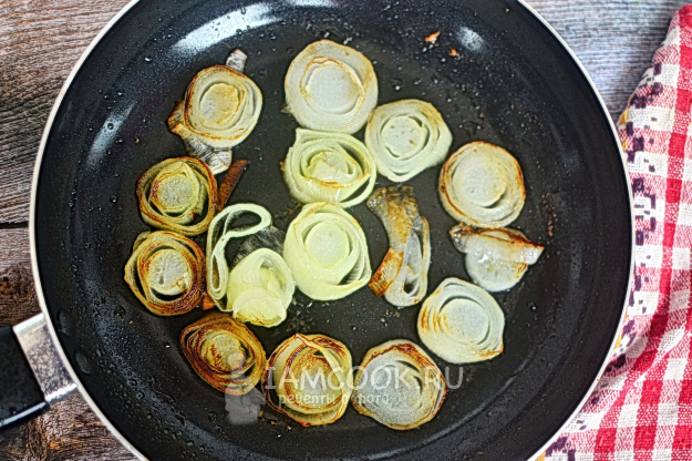Грибочки поджарим с двух сторон и отложим, а лук поджарим до легкого золотистого цвета.