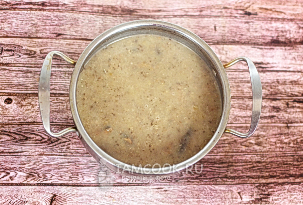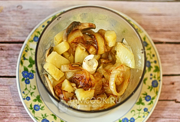Извлекаем из кастрюли часть картофеля и грибов (примерно треть), помещаем в чашу блендера вместе с ранее поджаренным луком.
