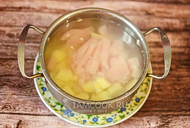 Сложим в кастрюлю филе и картофель, наполним кастрюлю водой, поставим на огонь и посолим. Доведем до кипения, соберем пену и уменьшим нагрев. Варим под крышкой 25 минут.