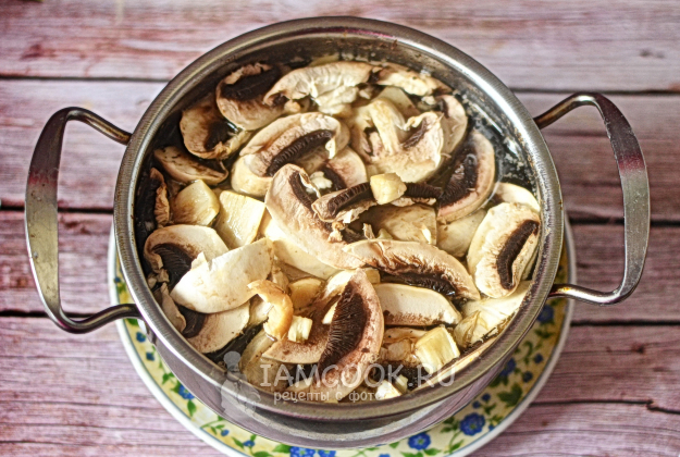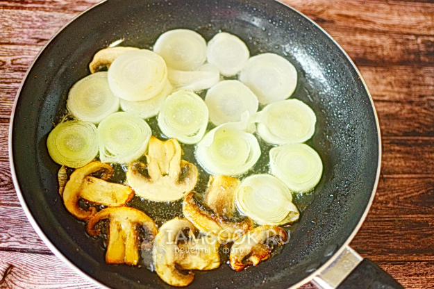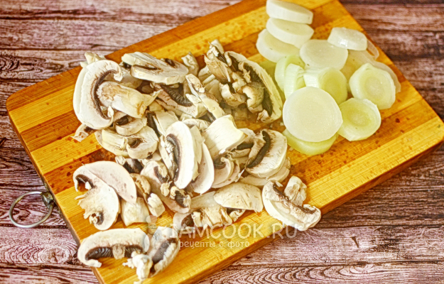 Лук и шампиньоны нарежем: лук — кольцами, а грибы — пластинками.