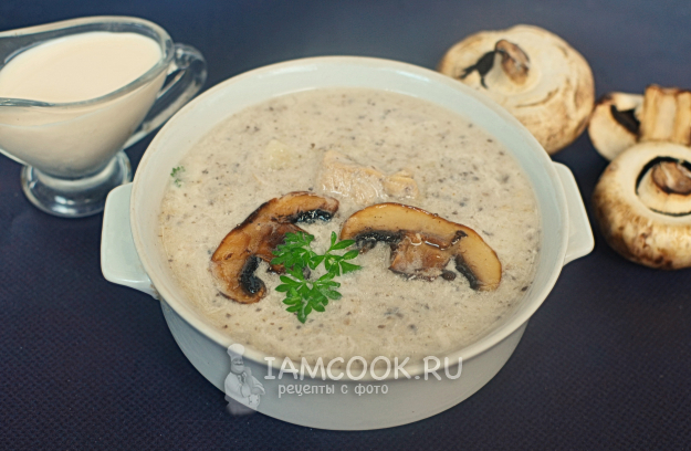 Сливочный суп с шампиньонами и курицей готов. Таким образом, у нас получился довольно густой суп, в котором часть компонентов растерта в пюре, а часть осталась целой. При подаче ранее поджаренные и отложенные пластинки грибов выкладываем в тарелку.