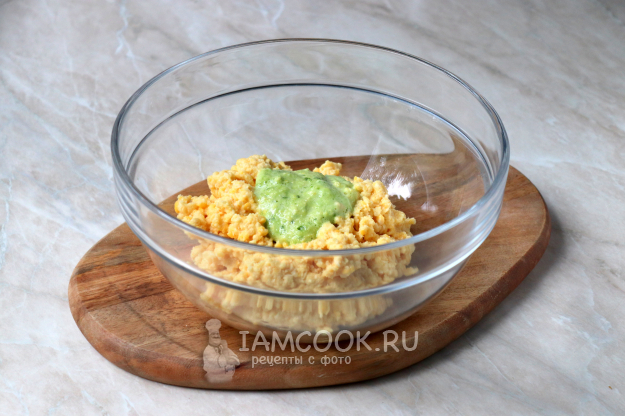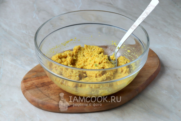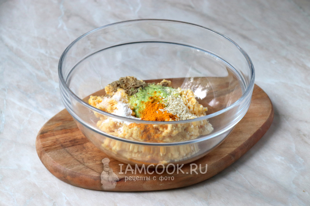 В миску с гороховой массой добавьте специи: соль, чёрный молотый перец, куркуму и кориандр, а также семена кунжута. Чтобы специи полностью открыли свои ароматы, перед использованием их следует протереть в ступке.