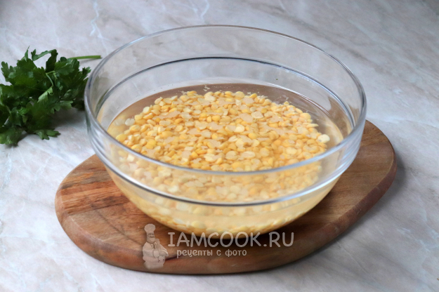 Горох тщательно промойте и замочите в холодной воде на ночь. За это время он впитает в себя часть жидкости, заметно увеличится в размерах и станет более мягким.