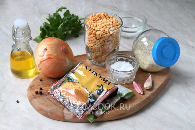 Возьмите необходимые продукты для приготовления фалафеля из гороха.