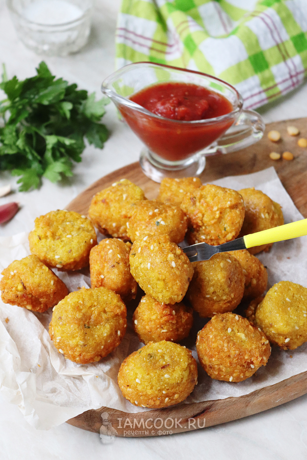 Фалафель из гороха получается ничем не хуже традиционного варианта. Хрустящий снаружи и мягкий внутри. Специи отлично дополняют данное блюдо, делая его особенно ароматным и пикантным. Подают фалафель в горячем виде с разнообразными соусами и зеленью.