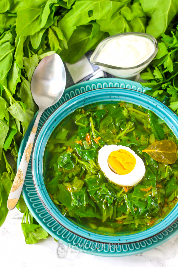 Разлейте суп из лебеды в глубокие тарелки. Очистите отварное куриное яйцо от скорлупы, промойте и разрежьте вертикально пополам. Выложите половинку яйца в тарелку и подайте первое к столу со сметаной любой жирности.
