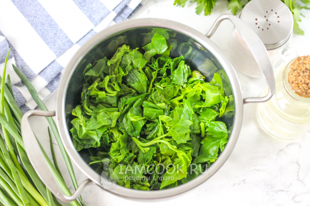 Пучок лебеды промойте в холодной воде, чтобы смыть с листьев пыль и грязь. Выложите в глубокую емкость. Вскипятите воду в чайнике или кастрюле и залейте ее в миску на лебеду, ошпаривая зелень. Оставьте на 4-5 минут, затем лишнюю жидкость стряхните.