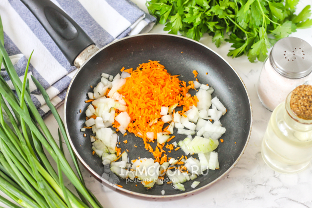 Очистите морковь и лук от кожуры, промойте в воде. Нарежьте лук мелкими кубиками, а морковь натрите на терке с мелкими ячейками. Отпассеруйте овощи в растительном масле примерно 3-5 минут, до румяности.