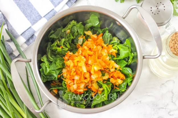 Нарежьте ошпаренную зелень лебеды лентами и выложите в кастрюлю.