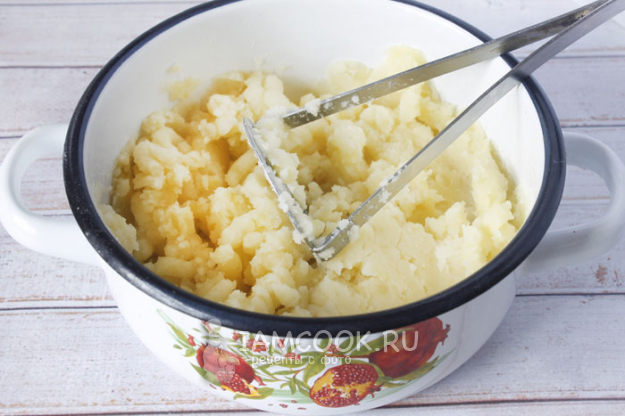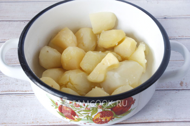 Готовим начинку. Картошку чистим, моем и отвариваем в подсоленной воде до готовности. Сливаем воду и кладем кусочек масла.