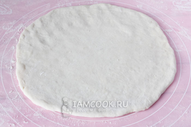 Аккуратно, чтобы не прорвать тесто, раскатываем заготовку скалкой в тонкую лепешку. Таким образом поступаем с остальным тестом и начинкой.