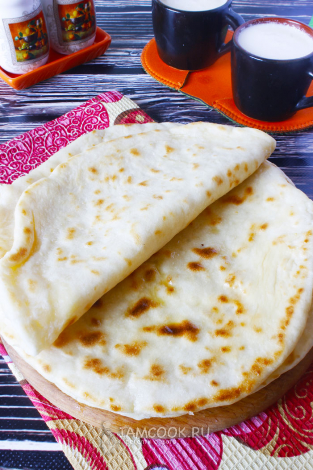 Жарим лепешку с двух сторон на хорошо прогретой сухой сковороде на среднем огне до коричневых пятнышек, примерно по 1,5-2 минуты. Так жарим все лепешки.