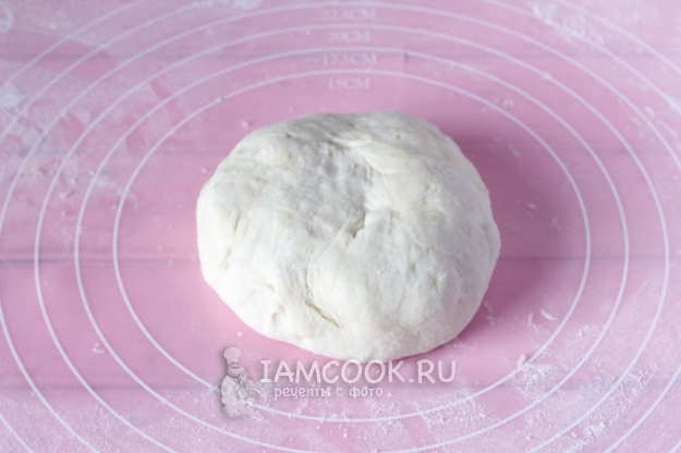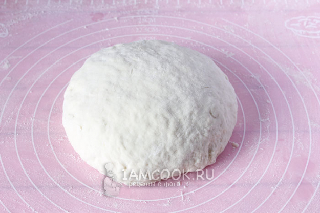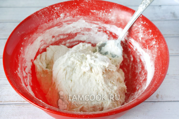 Когда масса соберется в комок, перекладываем ее на стол и, продолжая частями всыпать муку, замешиваем мягкое тесто. Оно должно еще слегка липнуть, но забивать его мукой не стоит. Формируем из теста шар, накрываем его пищевой пленкой и даем полежать 20 минут.