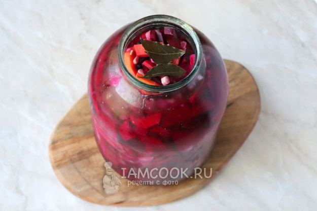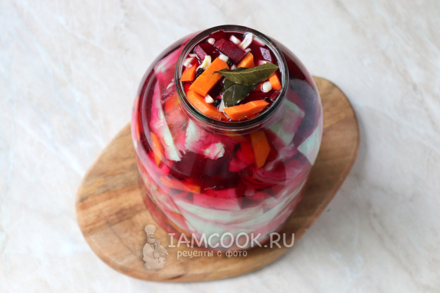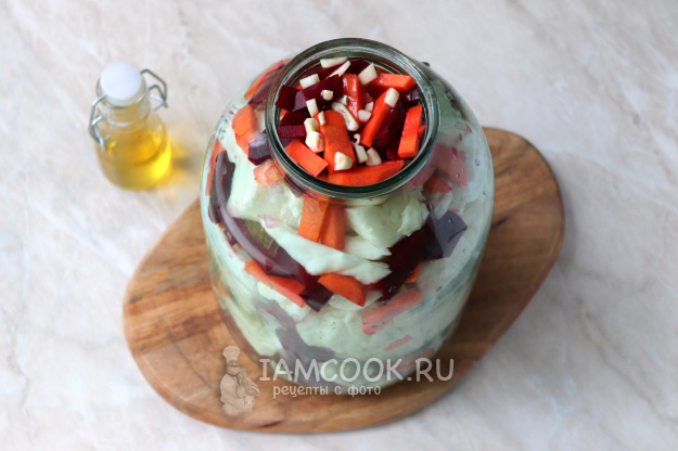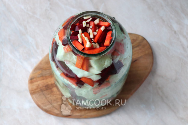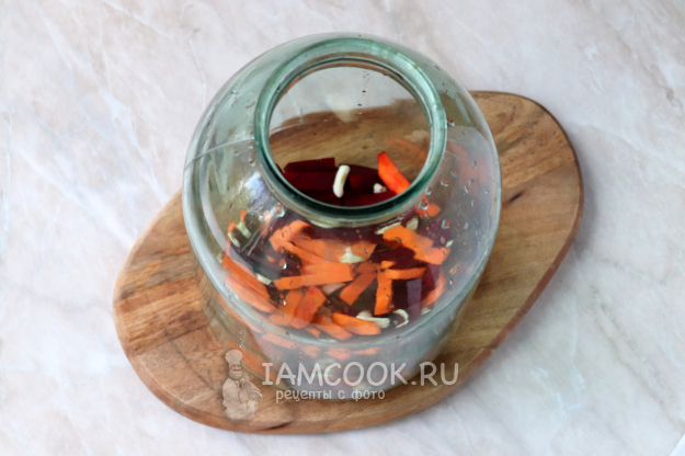 На дно 3-литровой банки выложить немного свеклы, моркови и чеснока.